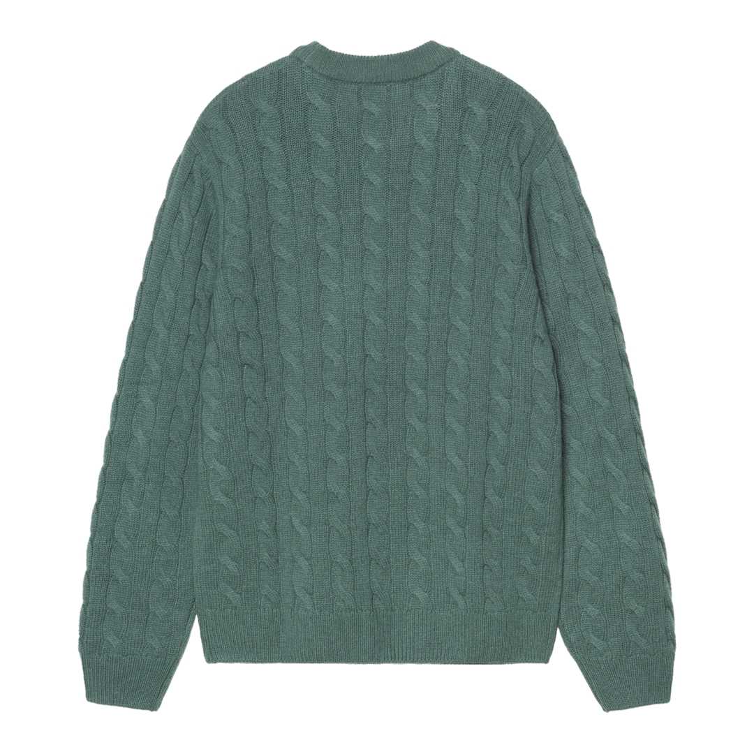 Le sweater 'Signature' est confectionné en tricot torsadé de fils de laine d'agneau épais de couleur verte. Il affiche une broderie graphique de couleur bleu sur la poitrine.
