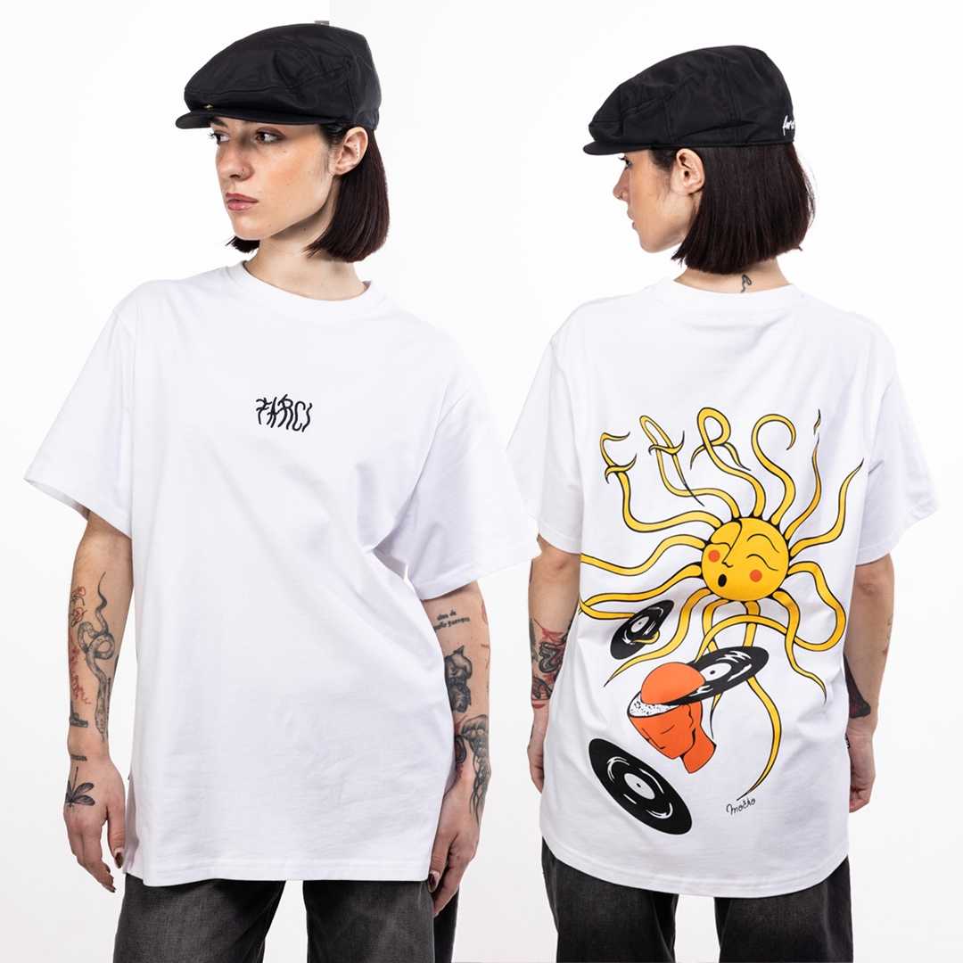 Léna Macka, illustratrice et tatoueuse lyonnaise, rejoint FARCI pour cette capsule. Son monde onirique et sensible leur a toujours beaucoup parlé & ils avaient à cœur de pouvoir transformer leur rencontre en un projet commun. Ici son personnage embrasse la musique frappée de soleil et d’écriture divine, Expire de la joie, inspire la merveille, à l’image de cette artiste dont la douceur dépasse les raisons du cœur.